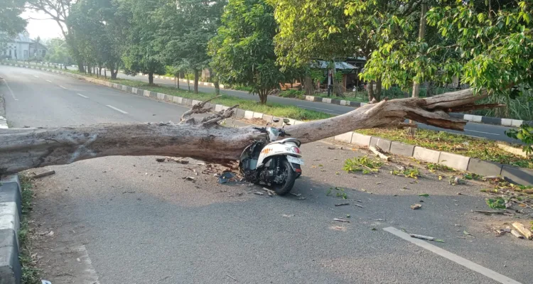 ACEH BESAR — Sebuah pohon tumbang di Jalan Bandara Sultan Iskandar Muda