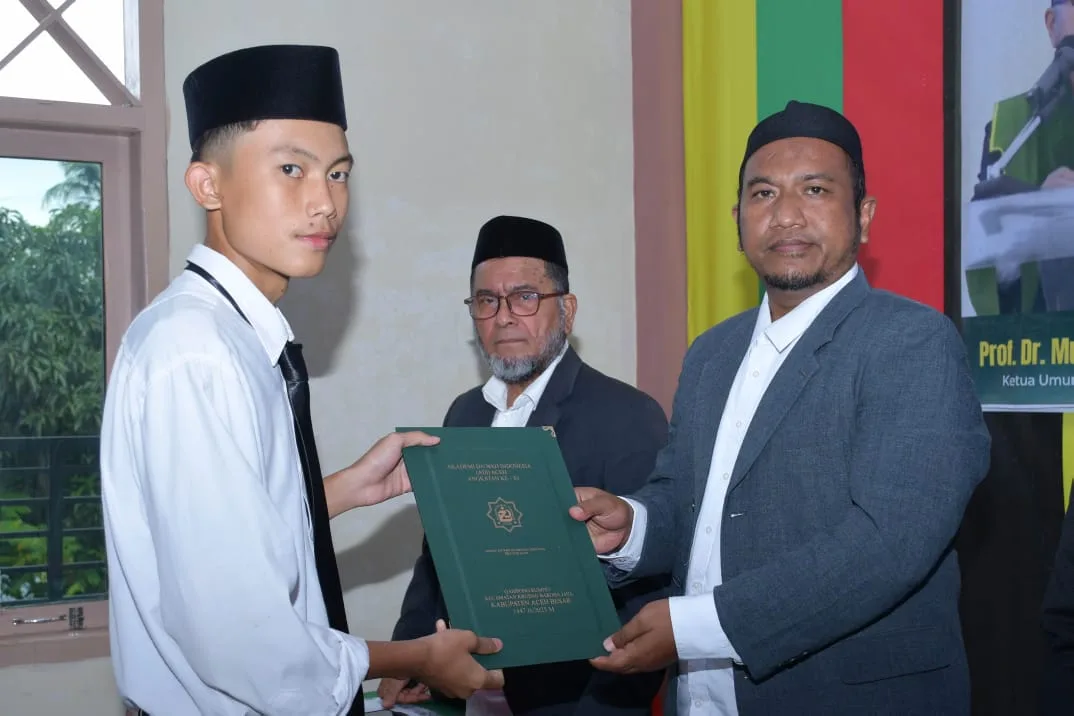 Direktur ADI Aceh, Dr. Abizal Muhammad Yati, Lc, MA bersama Ketua Umum Dewan Dakwah Aceh, Prof. Dr. Muhammad AR, M.Ed., menyerahkan ijazah kepada wisudawan dalam acara tasyakuran di Kampus ADI Aceh, Komplek Markaz Dewan Dakwah Aceh, Gampong Rumpet, Kecamatan Krueng Barona Jaya, Kabupaten Aceh Besar, Sabtu (2/8/2024).