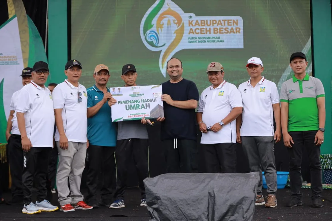 Wakil Bupati Aceh Besar, Drs Syukri A Jalil menyerahkan doorprize paket umroh kepada peserta jalan sehat memperingati Uroe Lahe (Hari Jadi) ke-69 Kabupaten Aceh Besar di Lapangan Bungoeng Jeumpa, Kota Jantho, Minggu (23/11/2025). FOTO/PROKOPIM PEMKAB ACEH BESAR
