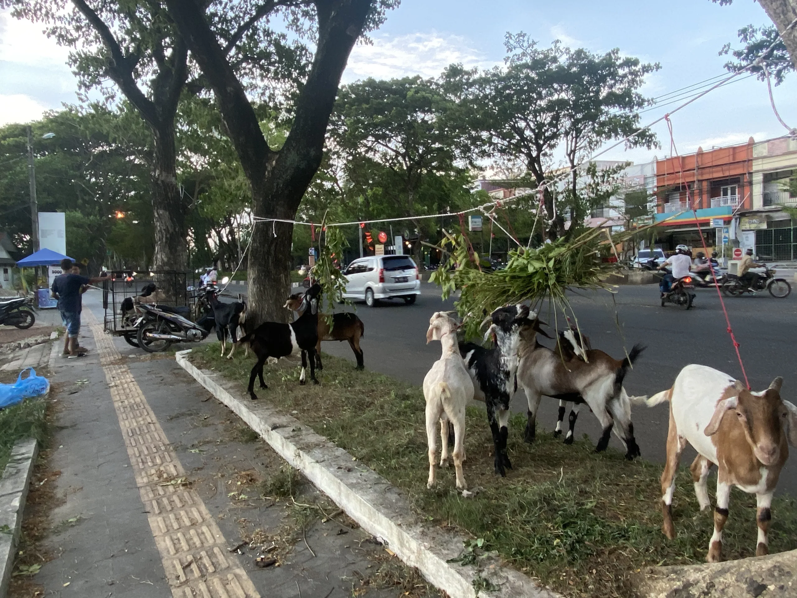 BANDA ACEH – Sejumlah pedagang kambing kurban mulai menjajakan dagangannya di sepanjang trotoar Jalan Prof. Ali Hasyimi, Gampong Ilie, Kecamatan Ulee Kareng, Kota Banda Aceh. Salah satu pedagang, Joel, mengaku telah mulai berjualan sejak pukul 08.30 WIB dan akan terus berjualan hingga meugang Idul Adha, mendatang. Joel mengatakan hingga hari ini ia sudah menjual sekitar 20 ekor kambing.