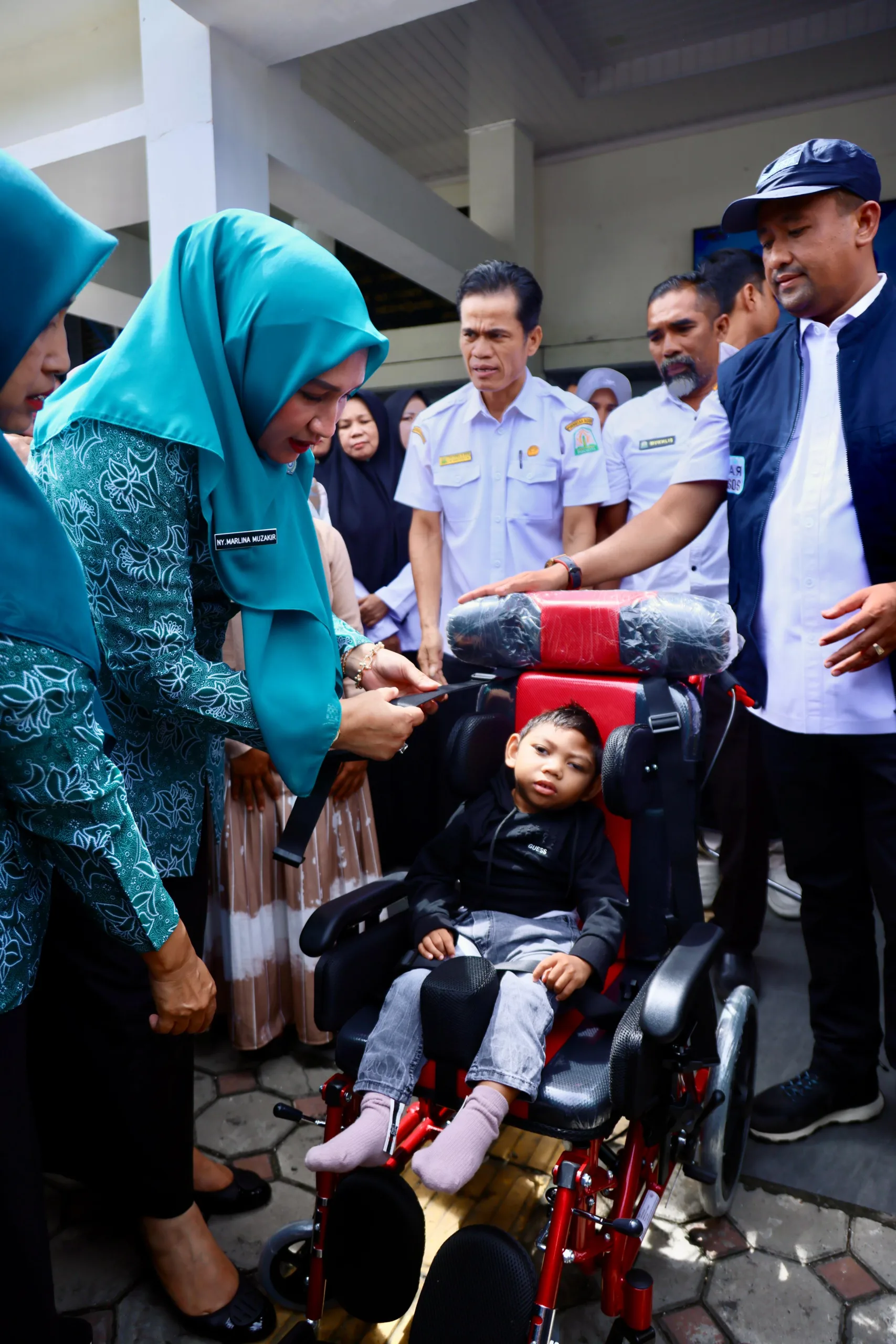Usai melepas keberangkatan truk bantuan masa panik, Kak Na langsung menemui Muhammad Rizki Maulana (3 tahun) untuk menyerahkan kursi roda pada bocah istimewa asal Gampong Deah Raya Kecamatan Syiahkuala, yang telah menantinya di lobi kantor Dinas Sosial Aceh.