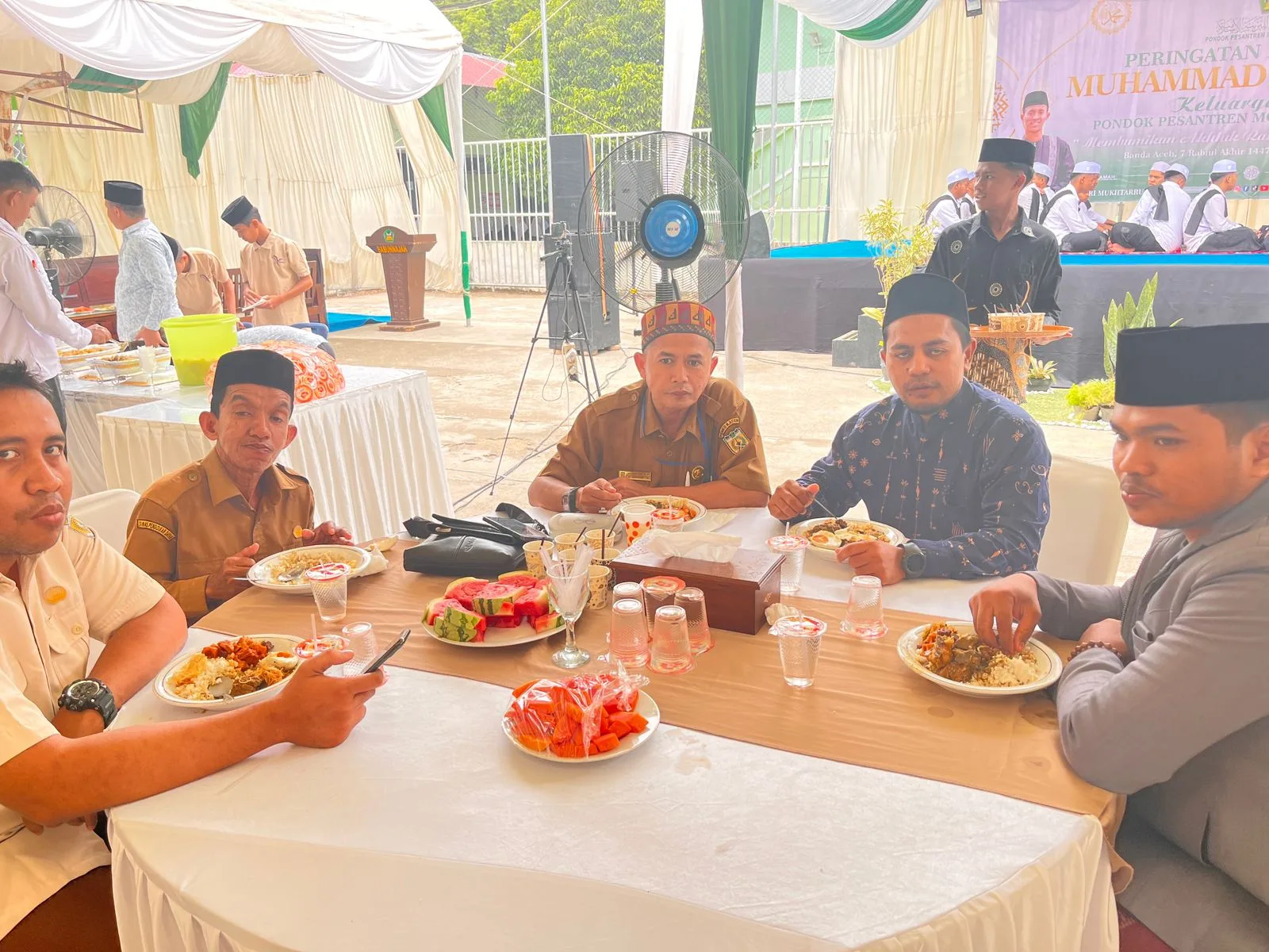 Berbagai menu terhampar dimeja mulai dari buah-buahan seperti; anggur, jeruk, salak, pisang, kolak, Jus jeruk serta berbagai menu khas Aceh. Tgk. Arifin Ramli, S.Hum Wakil Pimpinan Dayah menyambut tamu dengan riang gembira.