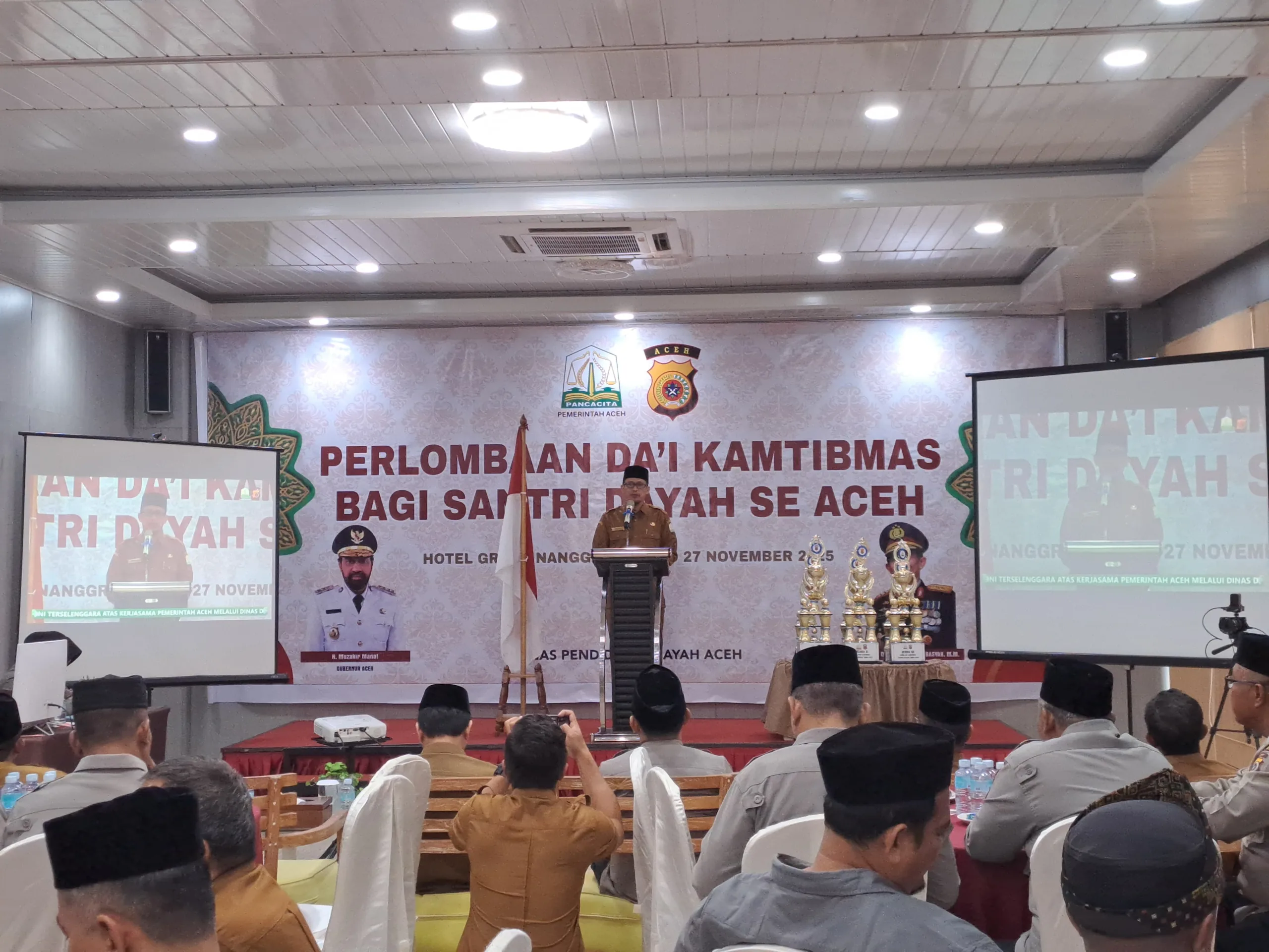 BANDA ACEH – Kegiatan Perlombaan da’i keamanan dan ketertiban masyarakat (Kamtibmas) bagi santri Dayah Se Aceh Tahun 2025 resmi dibuka. Kegiatan tersebut digelar oleh Dinas Pendidikan Dayah Aceh Berkolaborasi dengan Kepolisian Daerah (Polda) Aceh yang dilaksanakan sejak Senin hingga Kamis, tanggal 24 hingga 27 November 2025 di Grand Nanggroe Hotel, Lueng Bata, Banda Aceh.