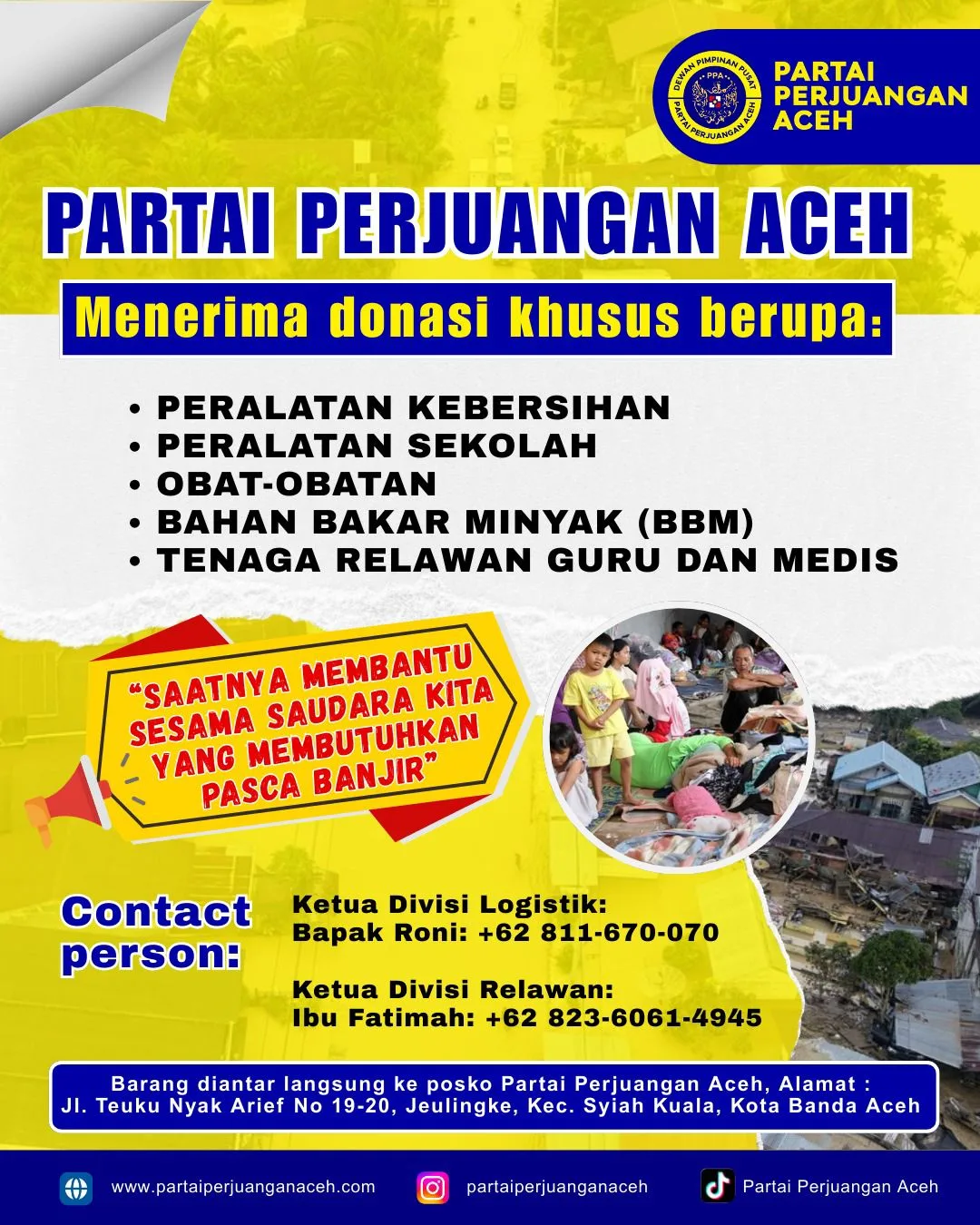 Seluruh bantuan dan donasi masyarakat nantinya akan dikumpulkan melalui Posko Resmi PPA di Kantor DPP Partai Perjuangan Aceh, Jalan T. Nyak Arief, Jeulingke, Banda Aceh. PPA membuka kesempatan bagi siapa pun yang ingin menyumbang, baik berupa barang maupun tenaga sukarela. Posko donasi dibuka setiap hari selama masa tanggap darurat untuk memudahkan masyarakat berpartisipasi.