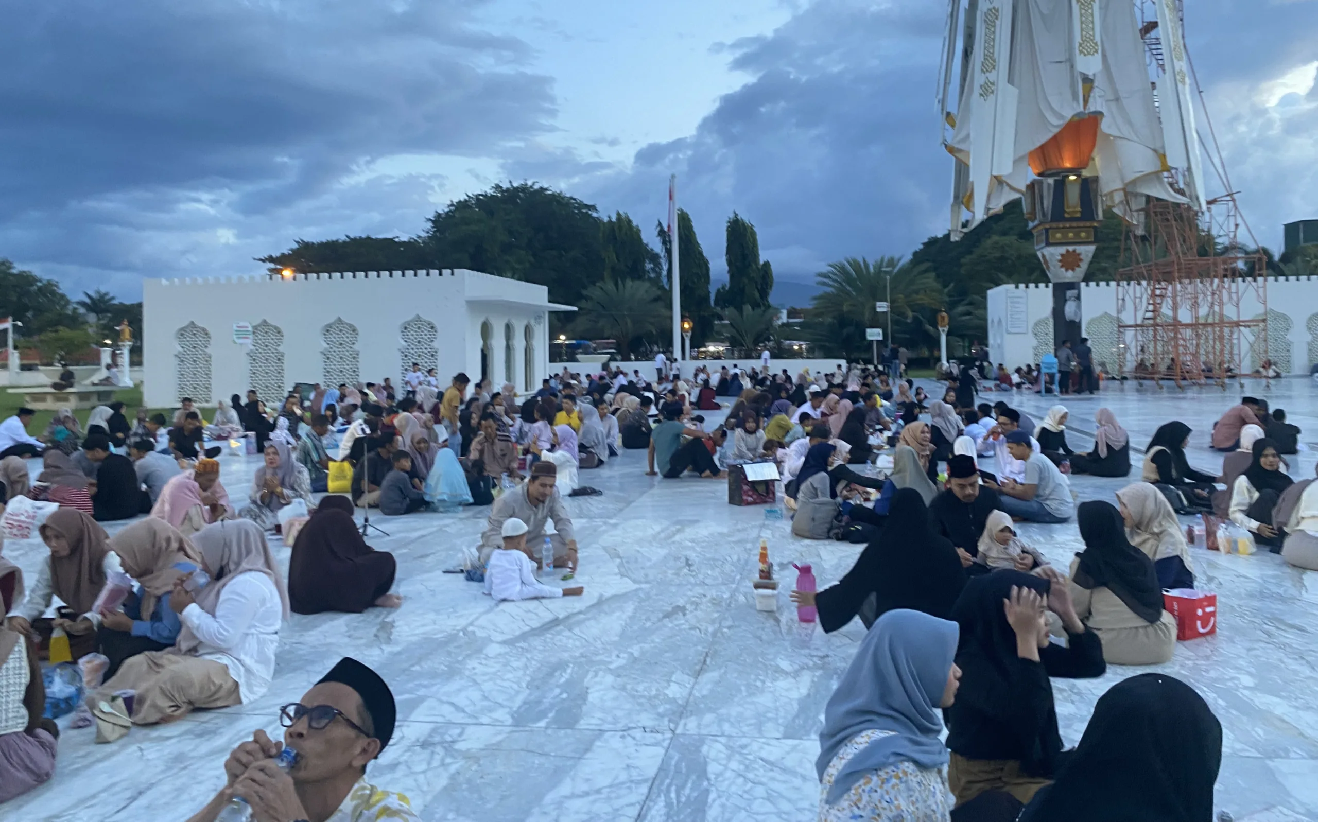Sejak sore hari, masyarakat dari Banda Aceh dan Aceh Besar mulai berdatangan dengan membawa hidangan sederhana untuk disantap saat azan Magrib berkumandang. Mereka duduk berkelompok di atas lantai marmer halaman masjid, menciptakan suasana hangat penuh kebersamaan.